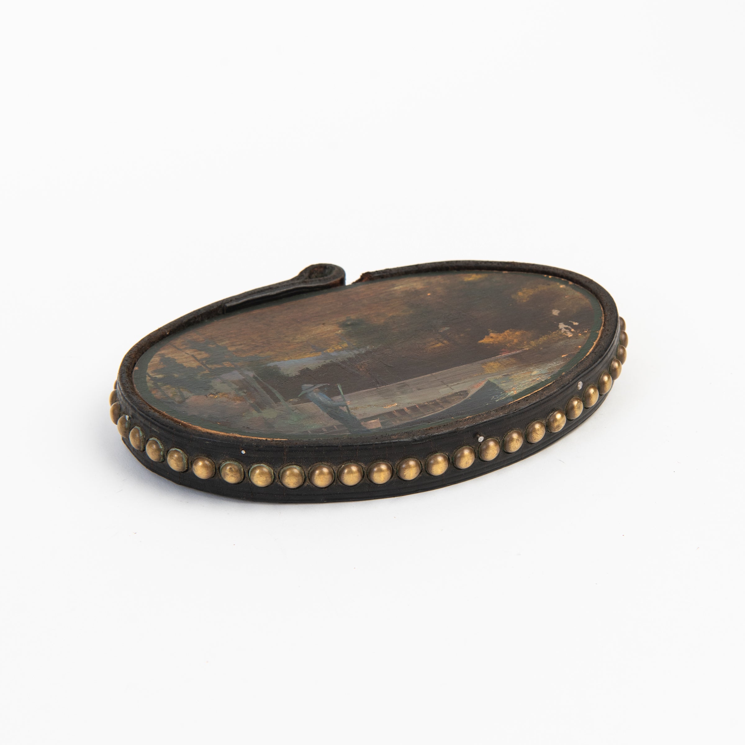 This vintage folk art piece features a hand-painted scene on aged wood, framed with a unique border of leather and brass studs. The combination of materials gives it depth, texture, and a handcrafted character that feels both rustic and refined. A rare find that works as wall art or a small decorative accent.