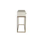 Picture this: a piece that not only lives up to its elegant name but dances effortlessly between sophistication and minimalism. Crafted from sturdy solid wood, wrapped in the softest cream hue. And oh, the details.... Rectangular gold legs and drawer handles sing in harmony, and provide perfect contrast against the neutral backdrop. The Claudine Console isn't just furniture, it's an ideally sized and incredibly flexible conversation starter console.