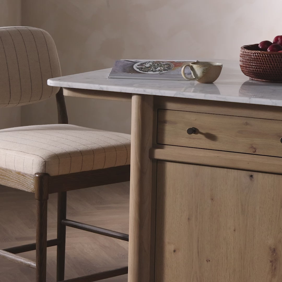 Modern materials place an updated twist on the traditional counter stool. Linen/cotton blend cushioning features a faint pinstripe for a unique-while-versatile look. Simply framed by brown oak and perfect in pairs or multiples.
