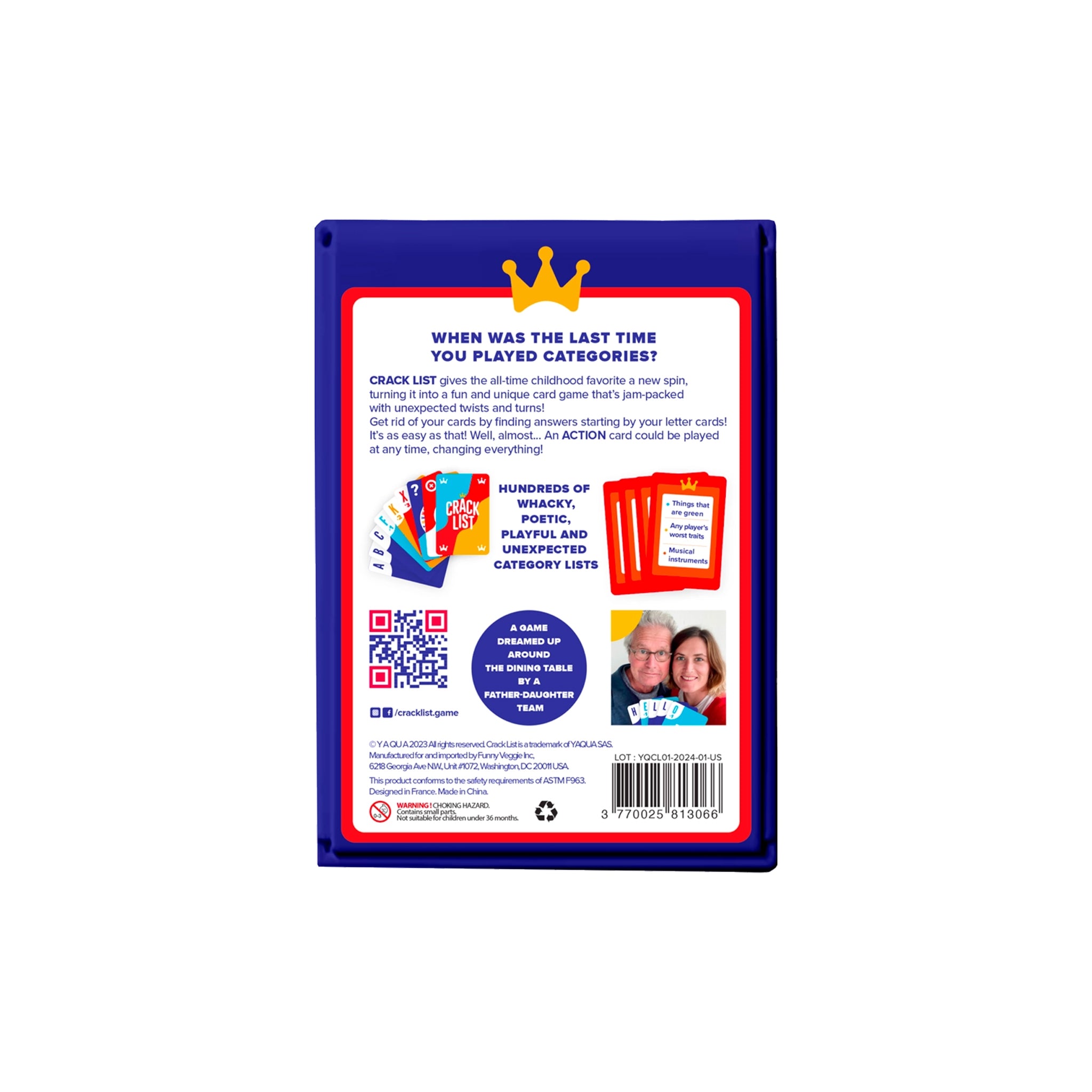 Crack List is a fast, fun, simple card game. Accessible to all generations: everyone has the chance to find answers and walk away a winner. Lots of laughs guaranteed.