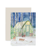 A winter wonderland unfolds in this peaceful scene of a snow-covered greenhouse glowing with holiday lights. Surrounded by birch trees, twinkling snow, and sweet woodland animals, it’s the perfect card for nature lovers, quiet moments, and celebrating the magic of the season.