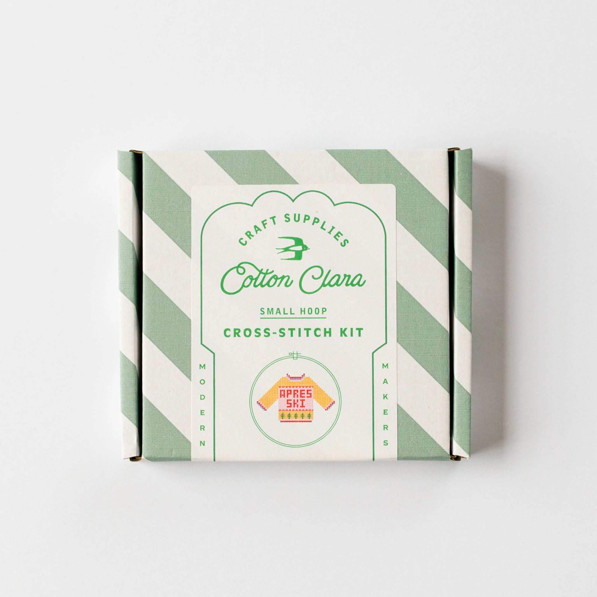 Get cozy with this apres ski sweater cross stitch kit set against a bright white background—perfect for gifting during the holidays or adding some fun to your winter crafting adventures! This 4.33" wide kit includes: hoop, fabric, thread, needle, backing disc, wadding, instructions and full color cross stitch chart. Packaging is fully recyclable, and contains no plastic. Made in the UK.