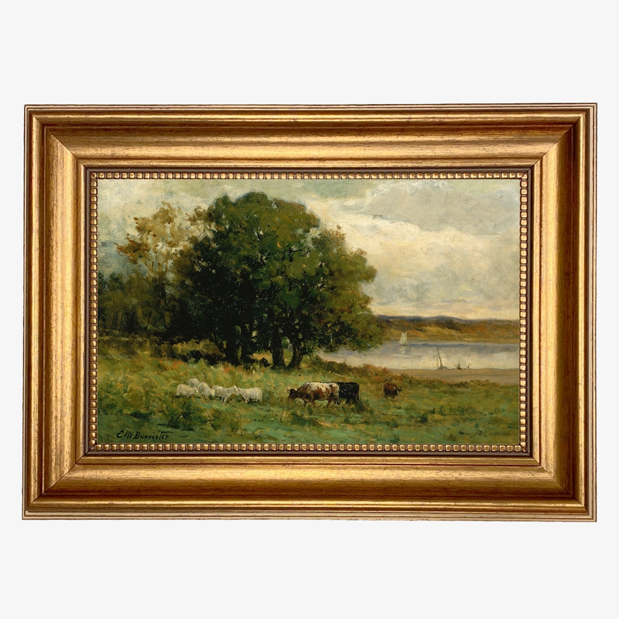 A lush agricultural landscape is honored by warm vintage vibes and muted tones in this reproduction of the original oil painting by Canadian American painter Edward Mitchell Bannister (1828-1901). Each high-resolution image is printed with archival-quality ink on matte canvas, board-mounted, and framed. Made in USA.