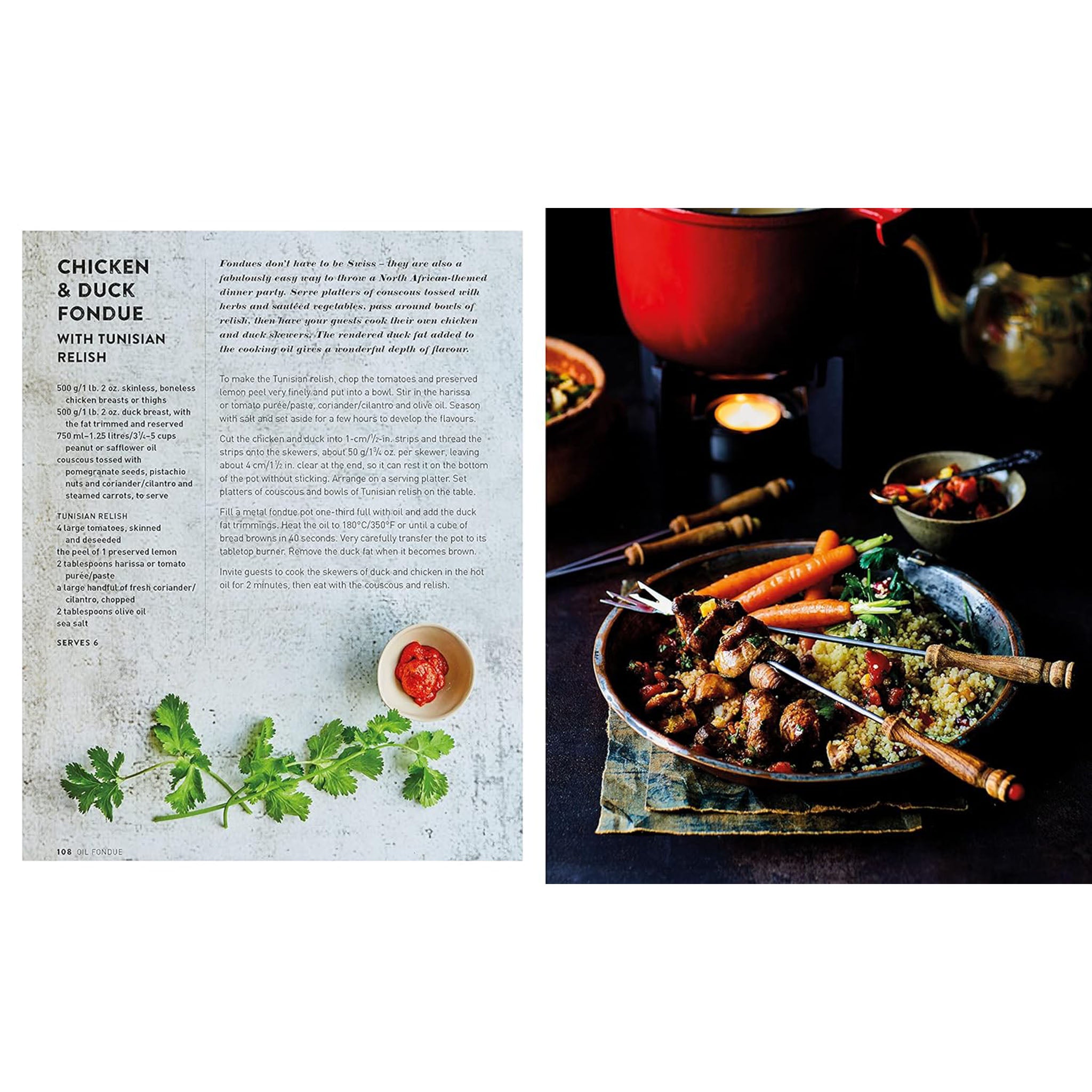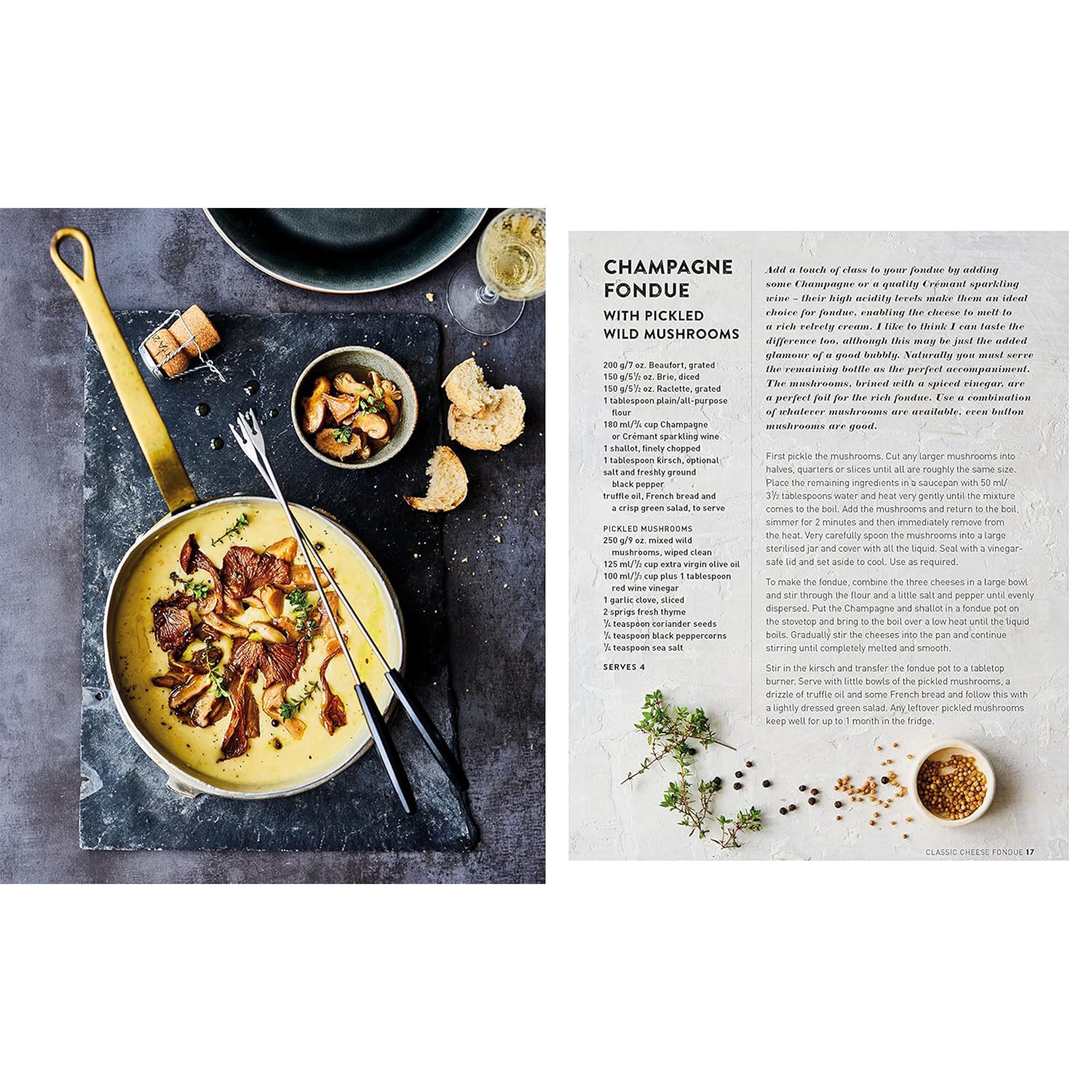 Not into cheese? Not to worry. There are also lighter choices, like stock fondues where food is cooked in a scented broth. And don't forget the sweet fondues – there's Chocolate with Orange & Chilli, or White Chocolate Fondue with Lemon and Gin! Enough recipes for a whole season of winter festivities.