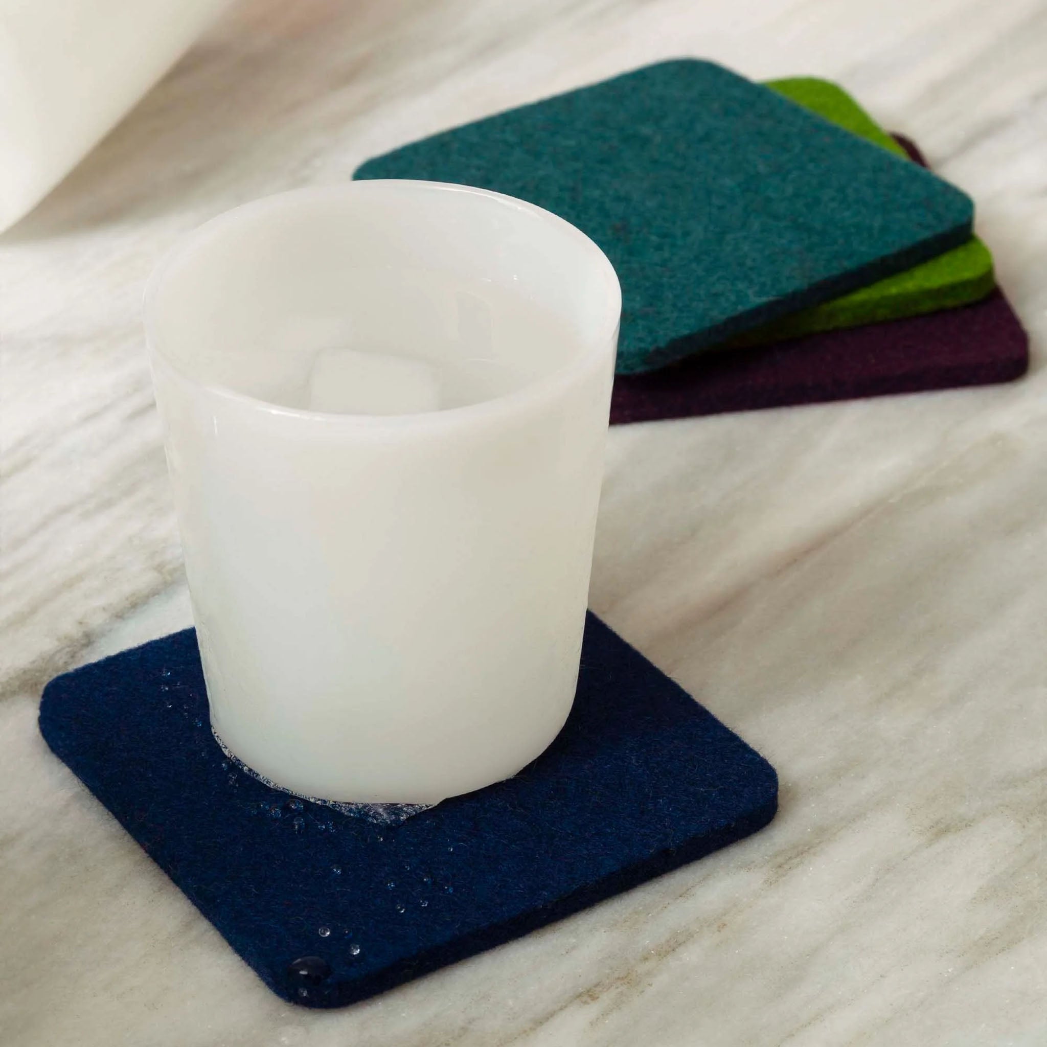 Details: 4" x 4" in 5mm merino wool felt. Includes 4 coasters. Available in classic square. Made in USA.