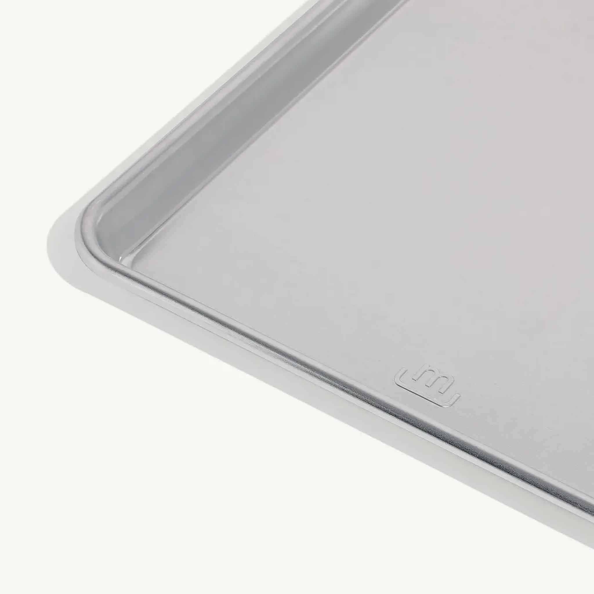 Each one is manufactured in the USA from commercial grade 3004 Aluminum to minimize weight and optimize heat conduction. This means cookies, biscuits, and more stop baking as soon as they emerge golden brown from the oven—your best protection against scorched and blackened bottoms. Unlike other cheaply made sheet pans, this one features a fully enclosed and rolled rim to act as a levee against juices escaping, prevent warping, and make cleanup easier.
