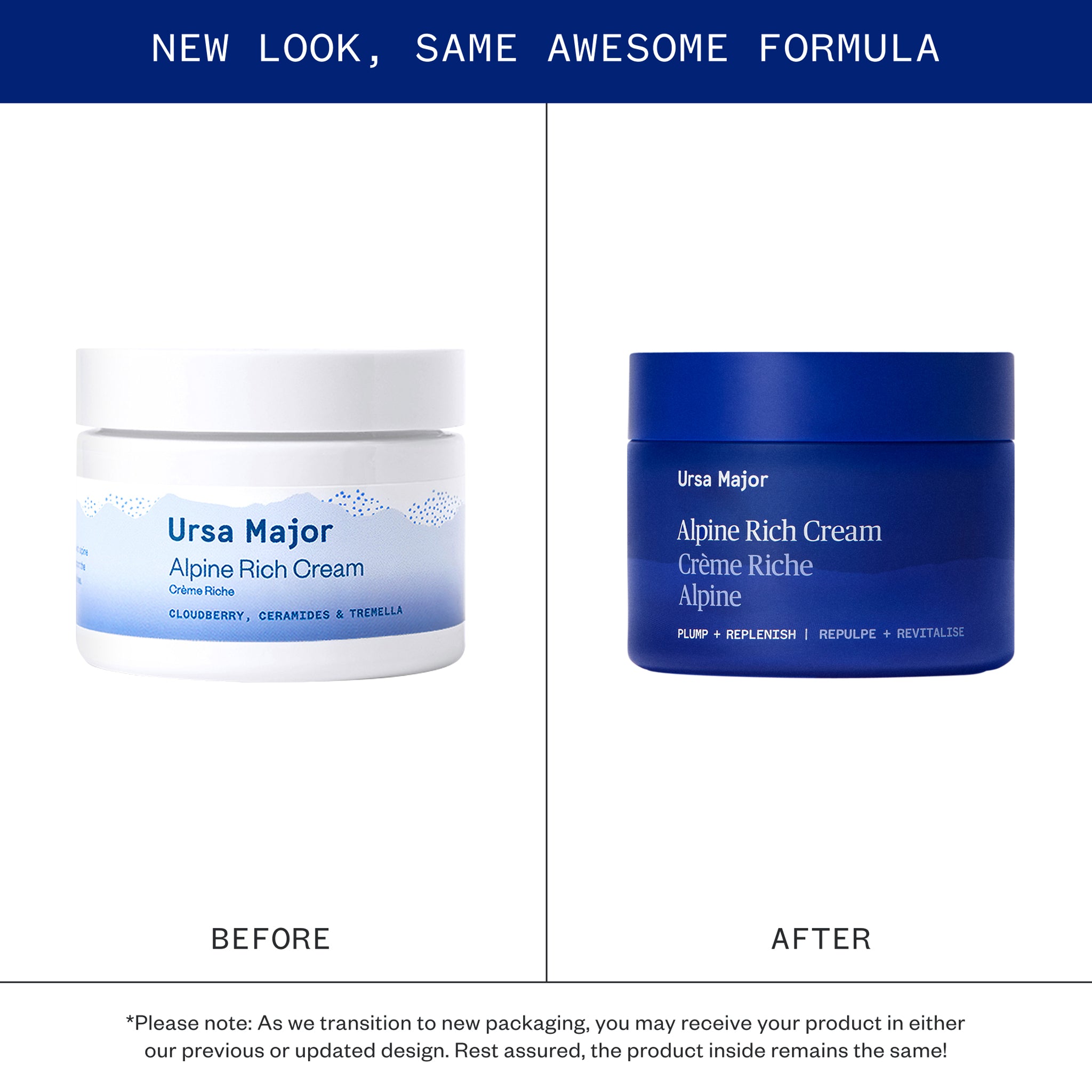 Plush, velvety perfection in a jar. Alpine Rich Cream is Ursa Major's richest cream yet, infused with alpine & forest actives to hydrate deeply, support the skin barrier, and soften the look of fine lines. Whether your skin needs extra TLC during colder months, or serious moisture all year round, Alpine Rich Cream is the jar you’ll reach for again and again. Made in USA.