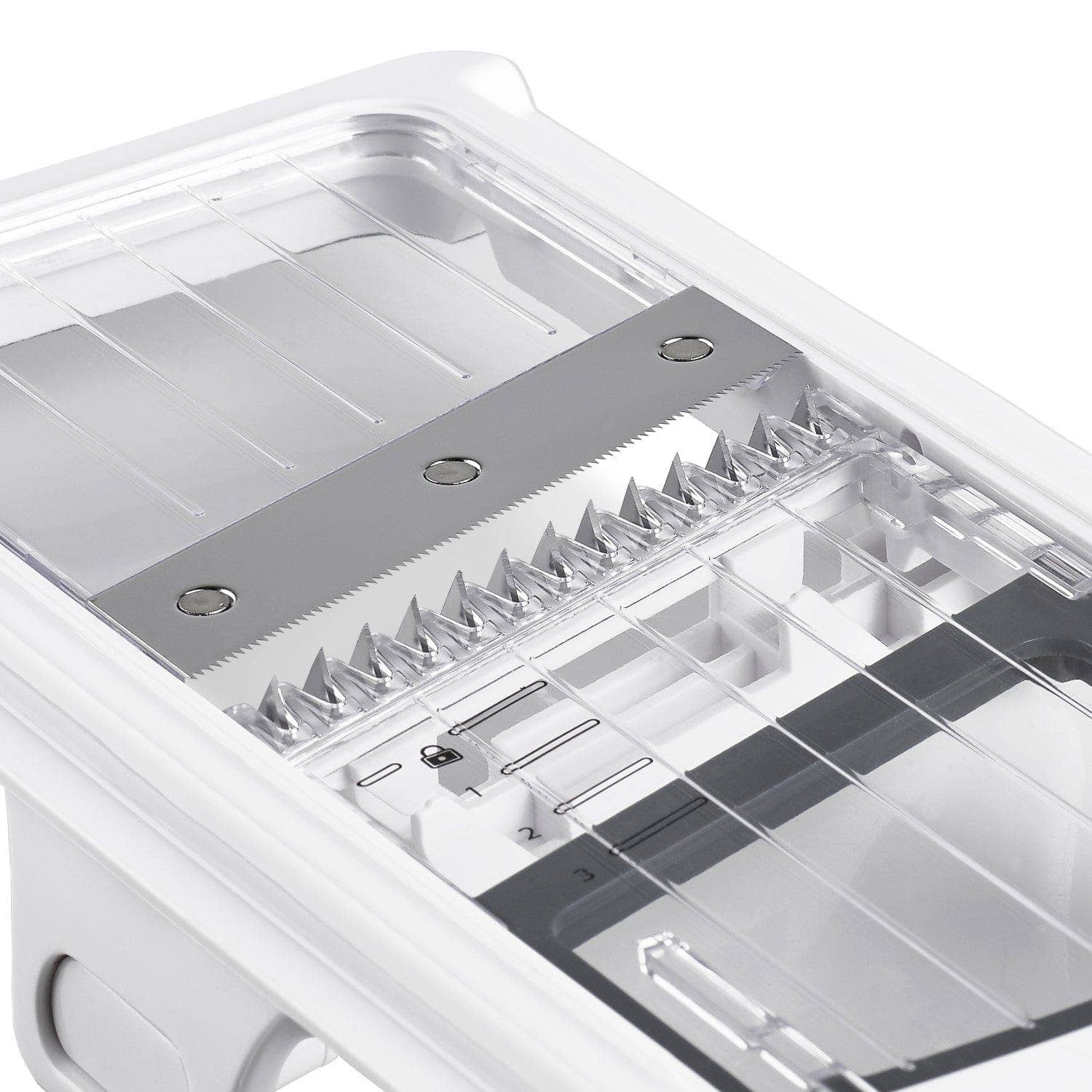 Details: Serrated stainless steel blade for uniform slices and julienne. Adjustable thickness selector. Built-in julienne blade with push-button control. Wide slicing surface for larger produce. Ergonomic angled handle with non-slip feet. Food holder for safer slicing. Dishwasher safe. Backed by a 5-year Zyliss guarantee.
