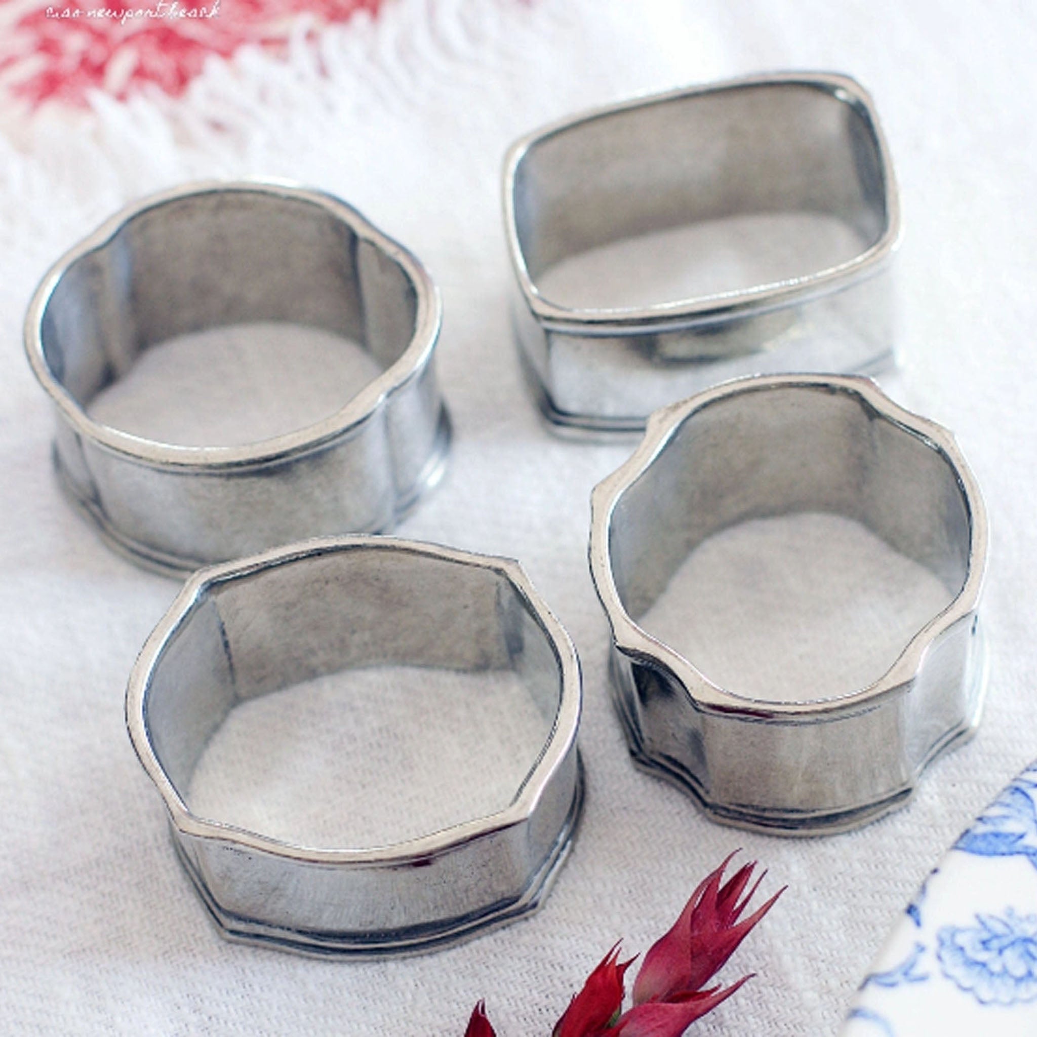 Hand-cast from pure pewter and finished with a polished shine, these rings exude traditional style and timeless form. Each gleaming band boasts a unique shape (the set includes four rings, each with its own distinctive design) and is subtly adorned with a raised edge pattern.