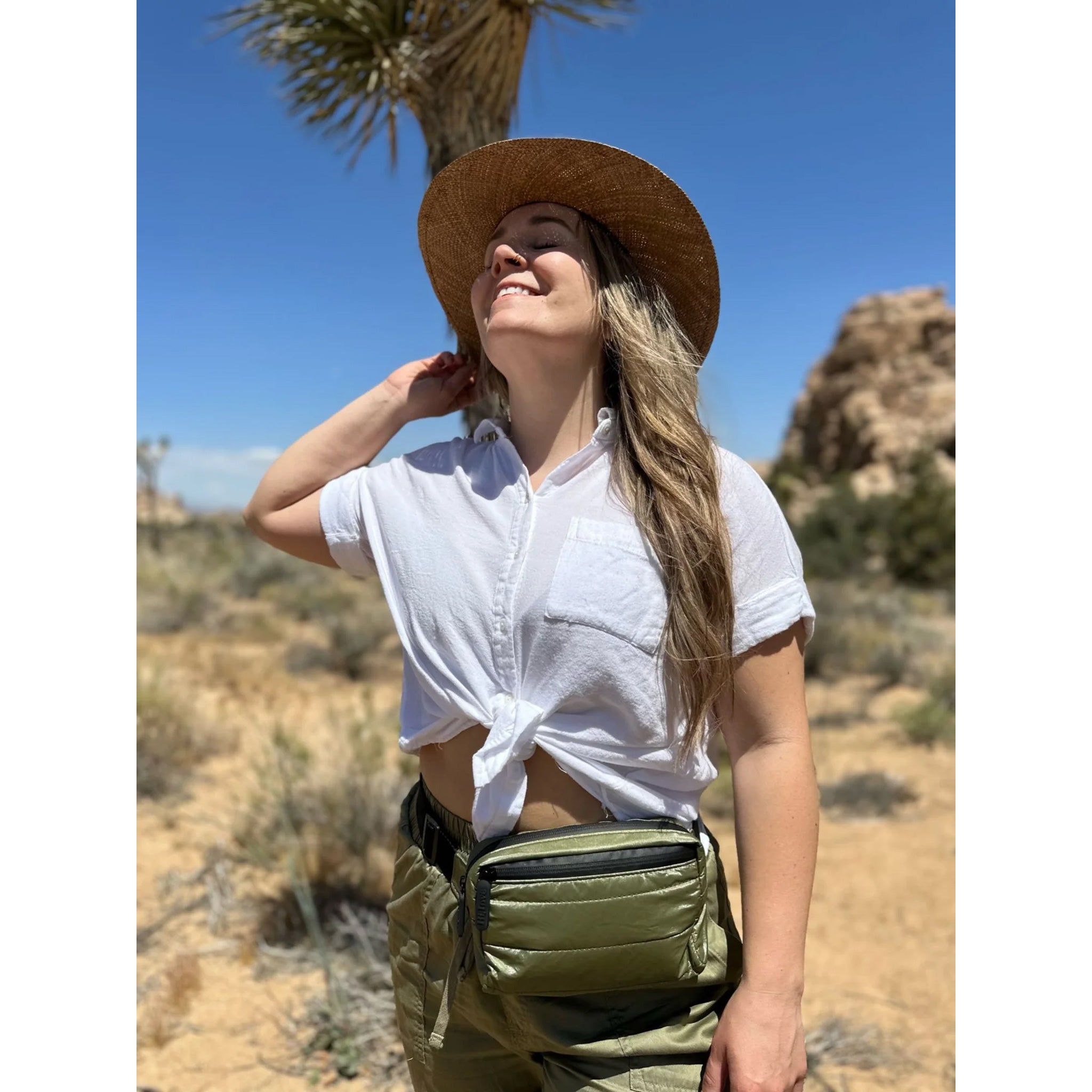 The bag that will never leave your side. Around town or the world, our plush and versatile puffer fanny in shimmer olive green is designed to accompany you on all your wildest adventures!