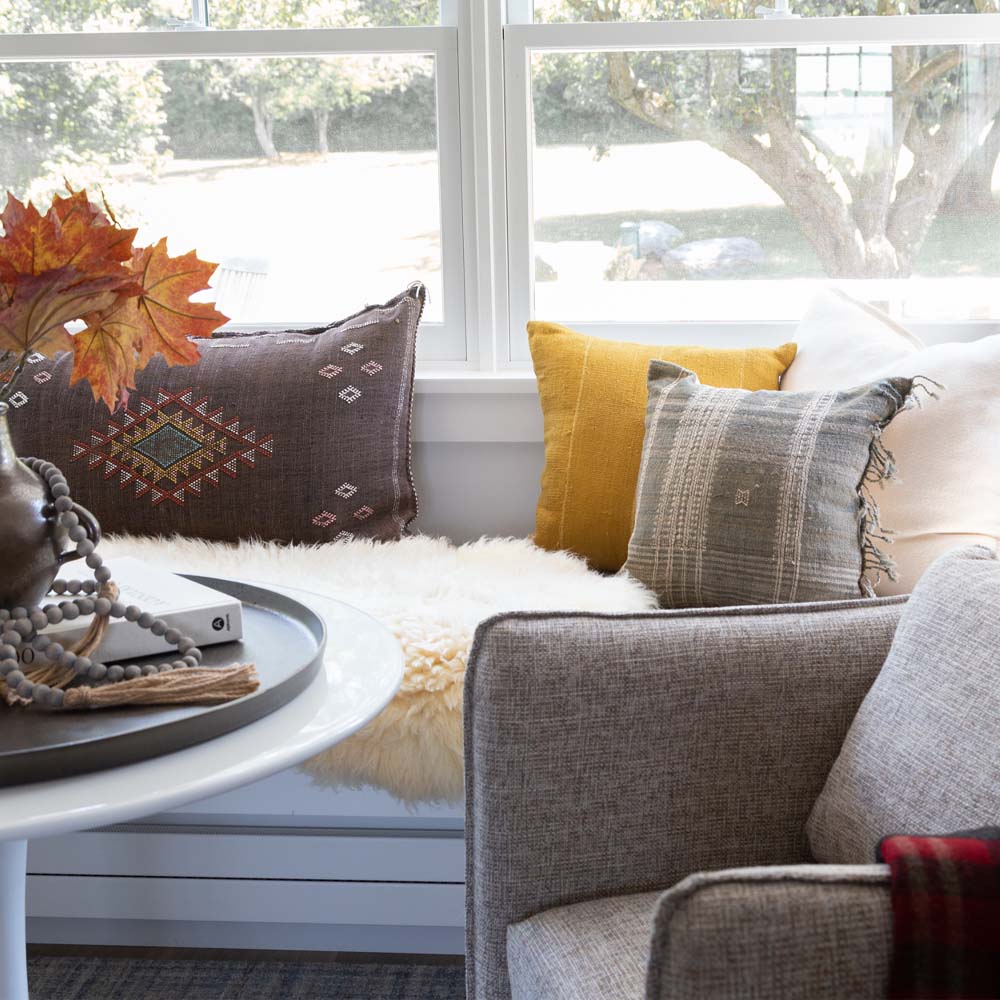 Moroccan silk embroidery against a natural backing. This one of a kind pillow is a statement in neutral luxury. Ideally sized for bench or bed bolster. Handmade, handwoven, and designed in Bend Oregon, USA.