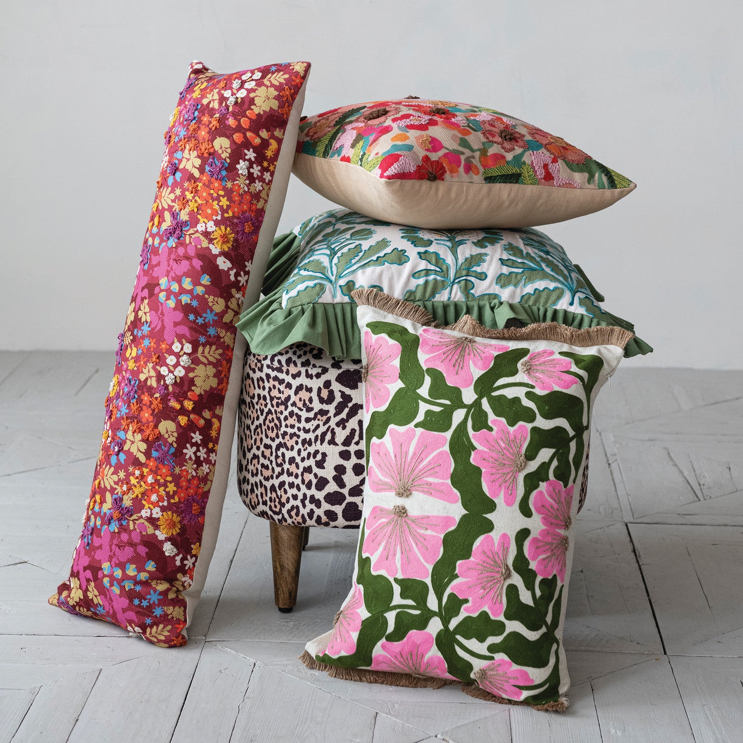A fresh take on a classic floral. The Sage Marigold Ruffle Pillow features a bold botanical pattern in soft greens and blues, accented with embroidered detailing that adds texture and depth. A gathered ruffle border frames the design, giving it a playful, tailored finish. Includes insert.