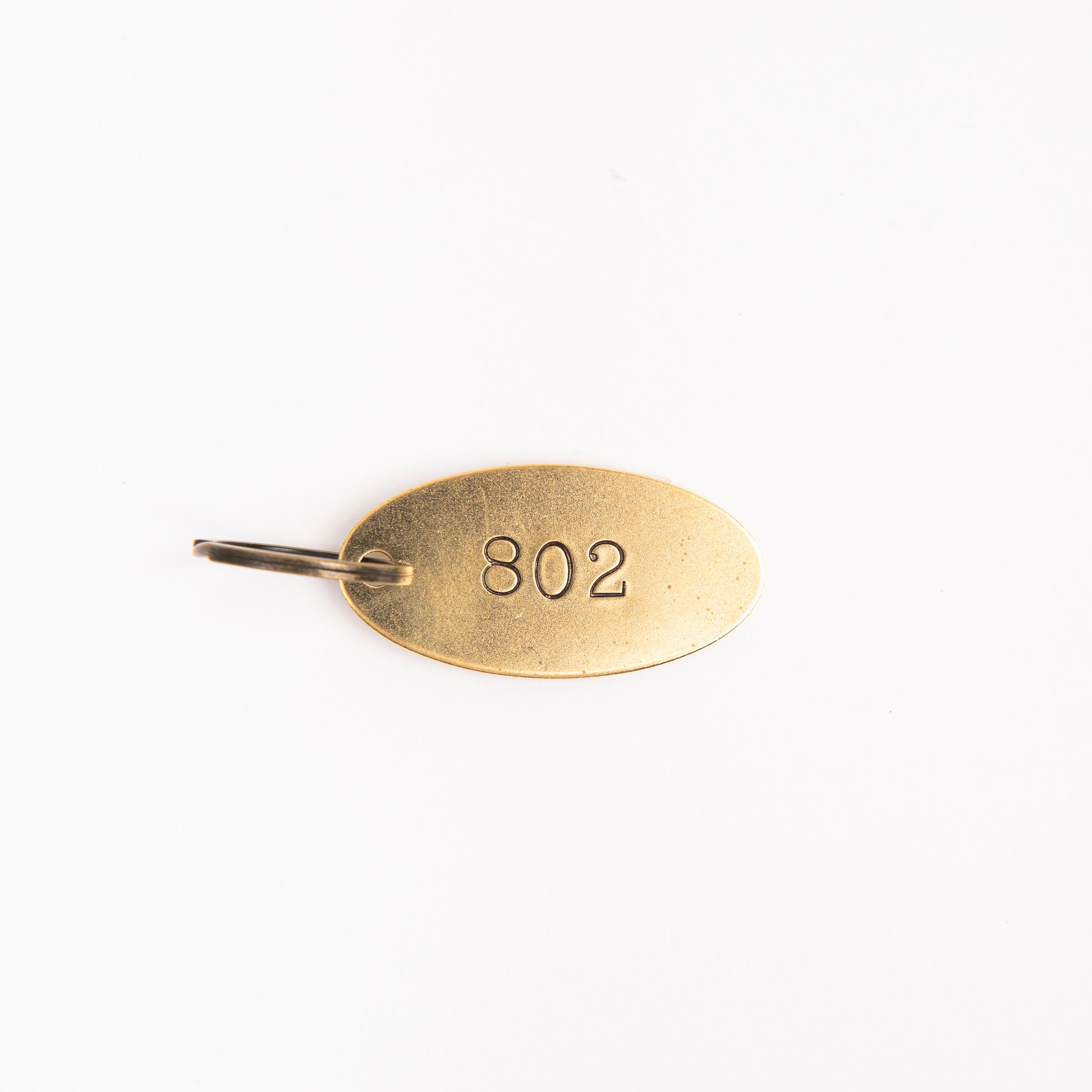 Solid brass tags are hand punched with vintage tool set and buffed for a look that is one of a kind. These tags are then crafted into our exclusive key chains. This time with: 802. Made in USA.