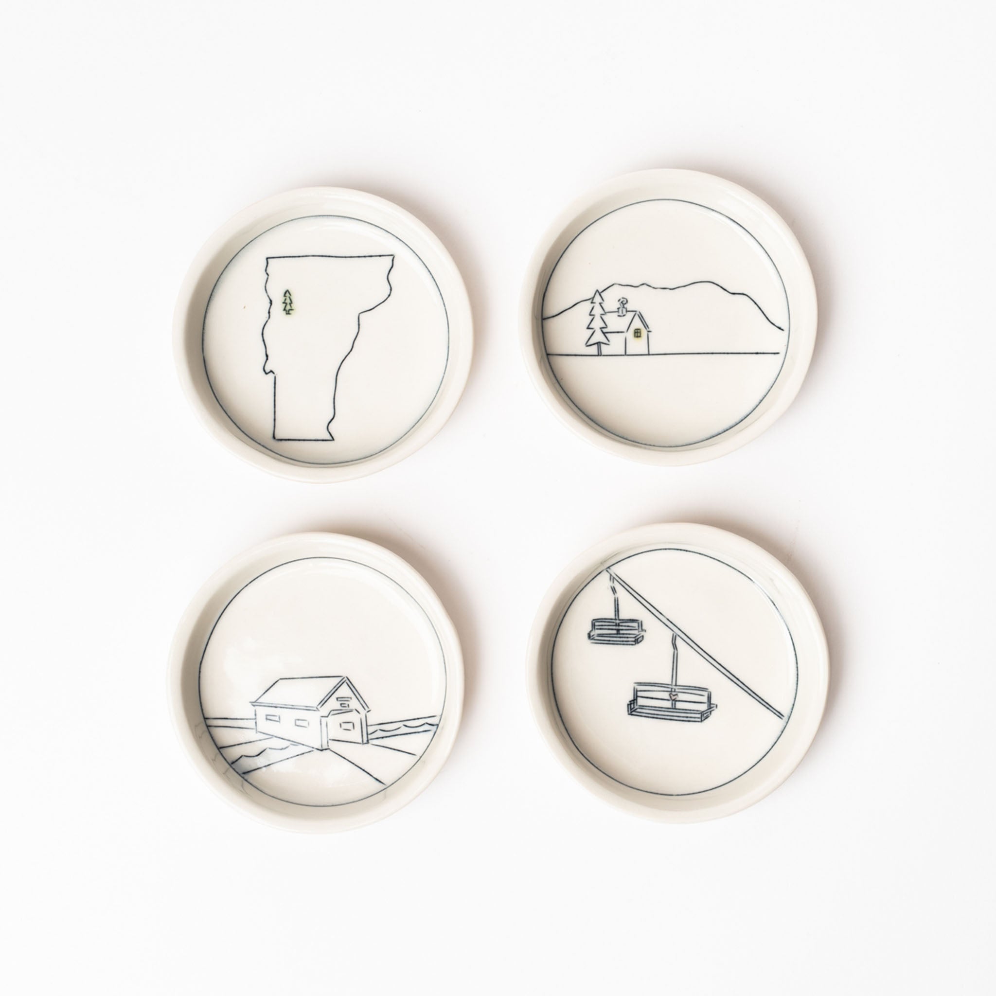 There are many ways to remember a place, a time, a journey or experience. Photographs. Postcards. Magnets. Our favorite? These little dishes. Paying homage to Vermont and its iconic imagery: Home. Bridge. Chairlift. Green Mountain State. Sold separately. Handmade in Massachusetts exclusively for Addison West.