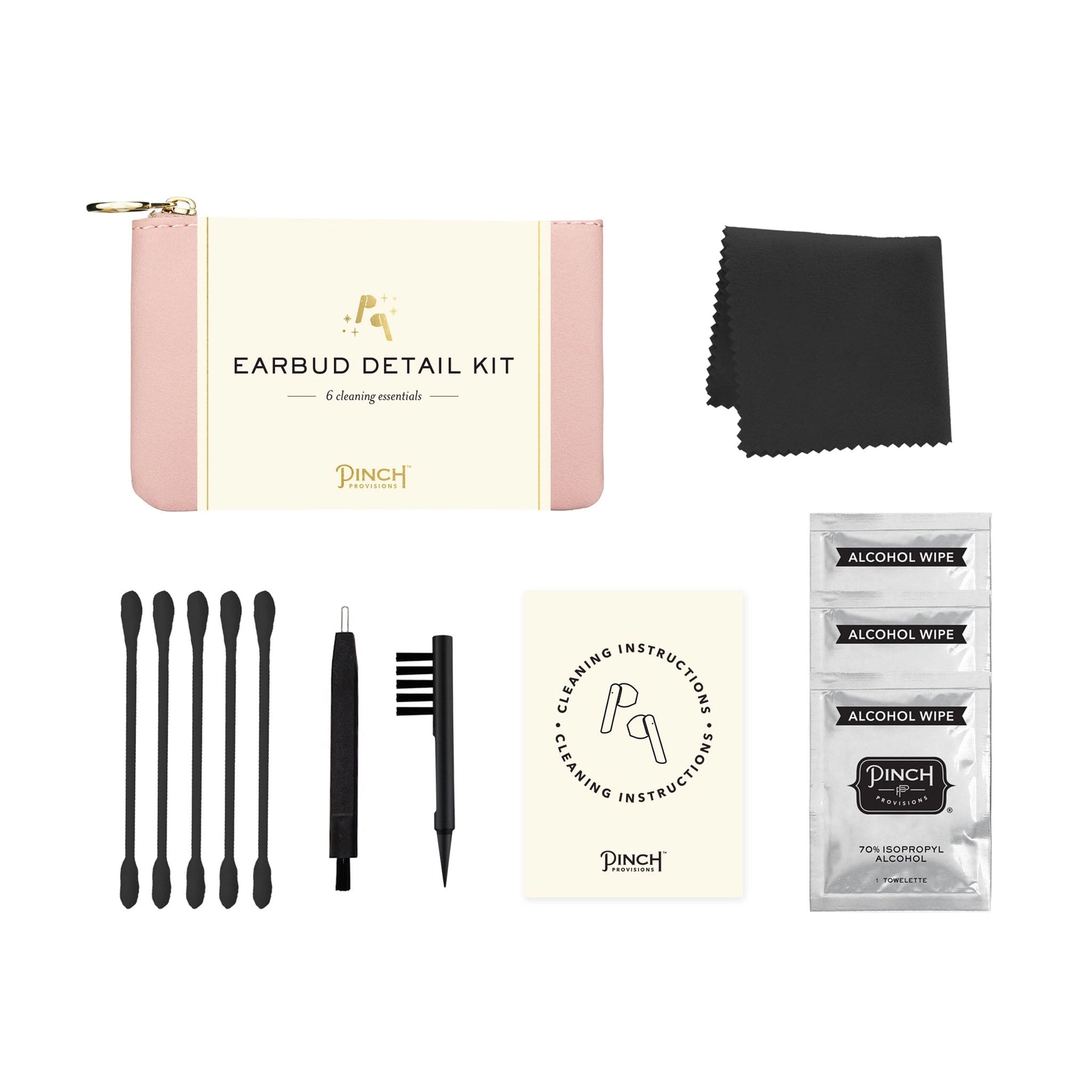 Meet the earbud problem-solver. From work to play, ear buds are constantly by our sides (literally!). Now you can give your buds some TLC with our Earbud Detail Kit. The kit contains 6 cleaning essentials, conveniently housed in a low profile vegan leather pouch.