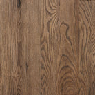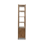 A rustic oak bookcase with fixed shelves shapes subtly curved corners, bringing a handcrafted look to a minimalist form. Classic hardware is finished in an aged bronze.