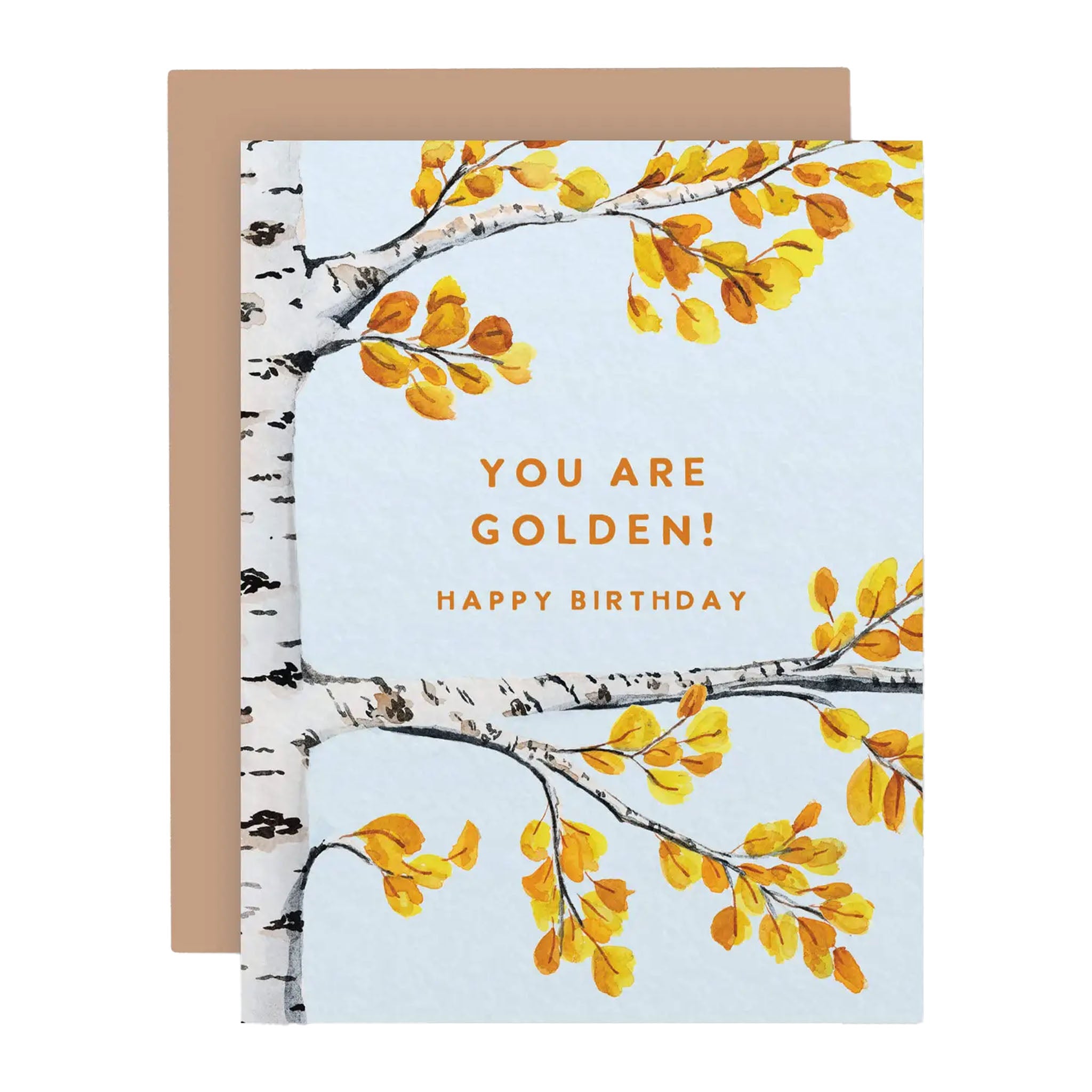 This watercolor greeting card features golden autumn leaves on aspen branches, capturing the warmth and beauty of fall. Blank envelope in brown harvest paper. Blank interior. Made in the USA.