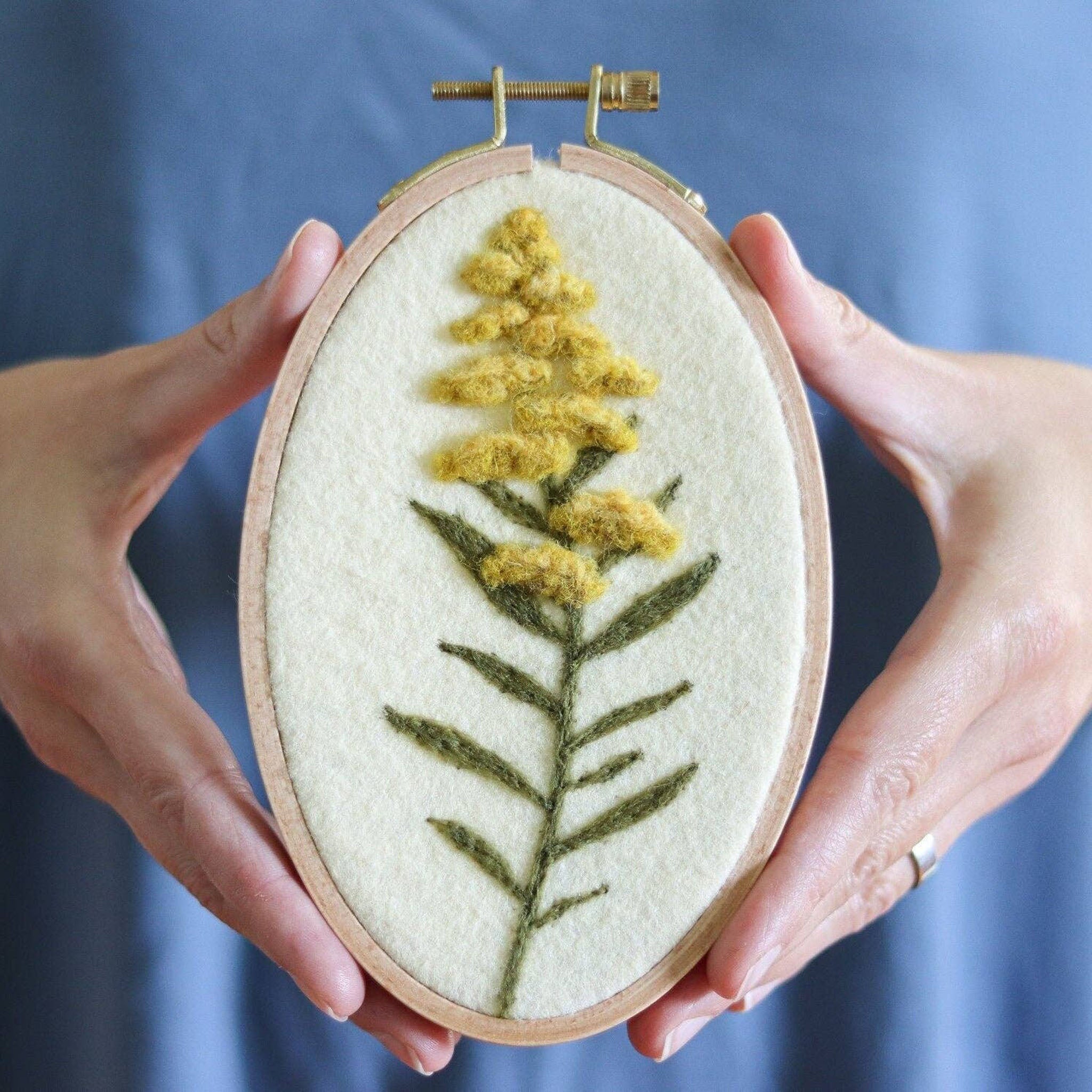 2 color-coded felting needles (one each of sizes #36T, #38T). High-density needle felting foam block. Sheet of pure wool felt. 4" x 6.25" oval wood embroidery hoop. All the wool you need to complete your goldenrod wool wall art!