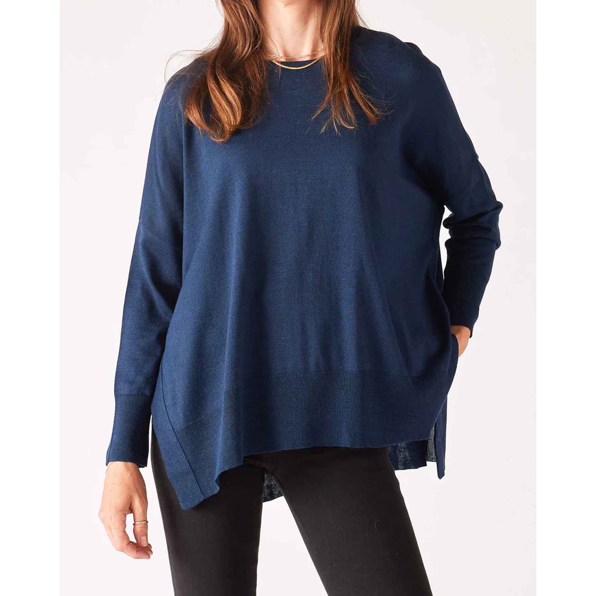 Details: Made with 70% acrylic and 30% polyester. Oversized fit. Length 27”. One size fits most. Models are 5’8” to 5’ 10” and wear a size 2-4. Machine wash gentle and tumble dry low. Made in Ecuador.