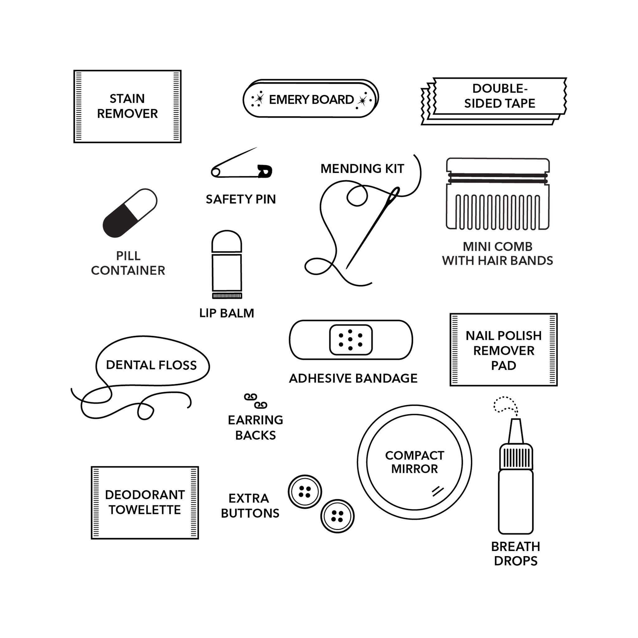 Details: 3.5"L x 2.3" W x 2.3" H. Includes 17 essential items including: stain remover, emery board, band aid, double sided tape, tooth floss, buttons, safety pins, earring bags, breath drops and more!