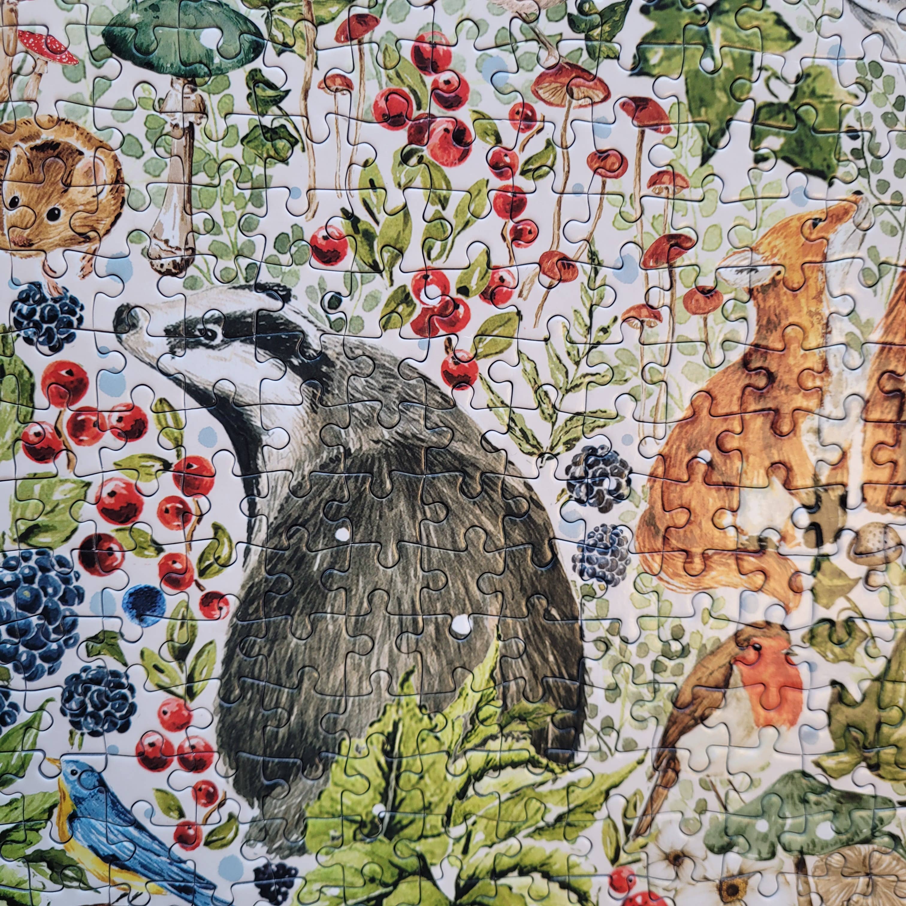 Snow gently starts to patter down onto the winter thicket in this beautiful 1000 piece jigsaw puzzle by The Art File. Even in the winter, this forest floor has many bounties to keep its animals well-fed for the colder months. Chestnuts, berries and mushroom caps sprout all around, and the animals gather in this beautiful opening in the forest. Owls, robins and finches perch on branches, while a mother fox and her pup enjoy the falling snow, a wise badger contemplates the change of season and a mischievous squirrel nibbles on a nut.