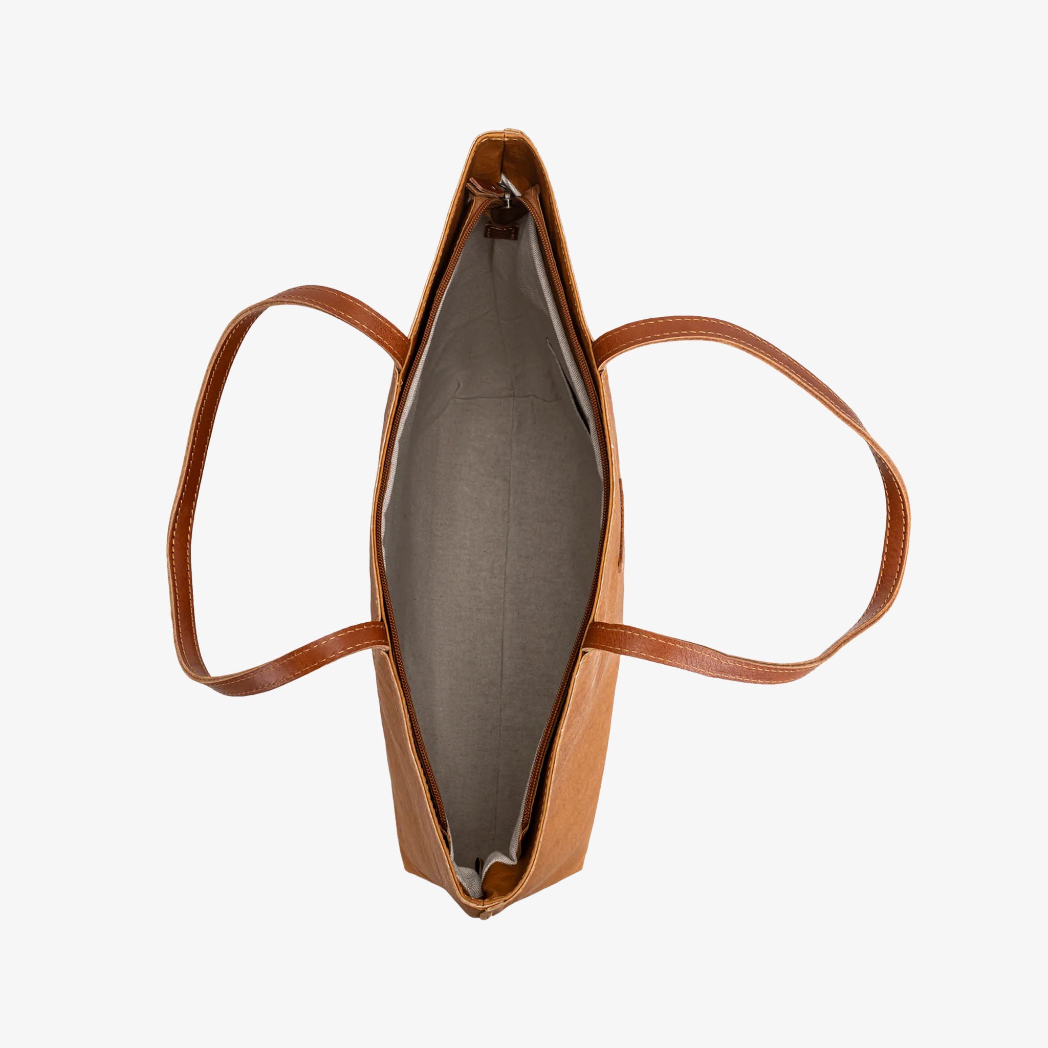 With its clean, minimal silhouette, this bag is all about effortless function and everyday versatility. Spacious enough to carry your essentials—and then some—it’s made from sustainably crafted washable paper that’s both feather-light and remarkably durable. Designed for daily ease, it features comfortable leather shoulder straps, an open top, and an interior lined with organic cotton. Inside, you’ll find a secure zip pocket, two open slip pockets, and a handy ring for clipping keys, glasses, or whatever you reach for most. Water-resistant, lightweight, and ready for anything.