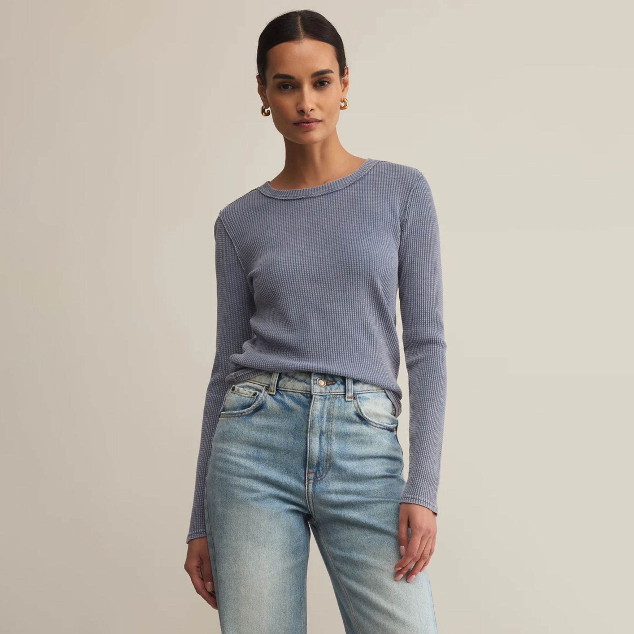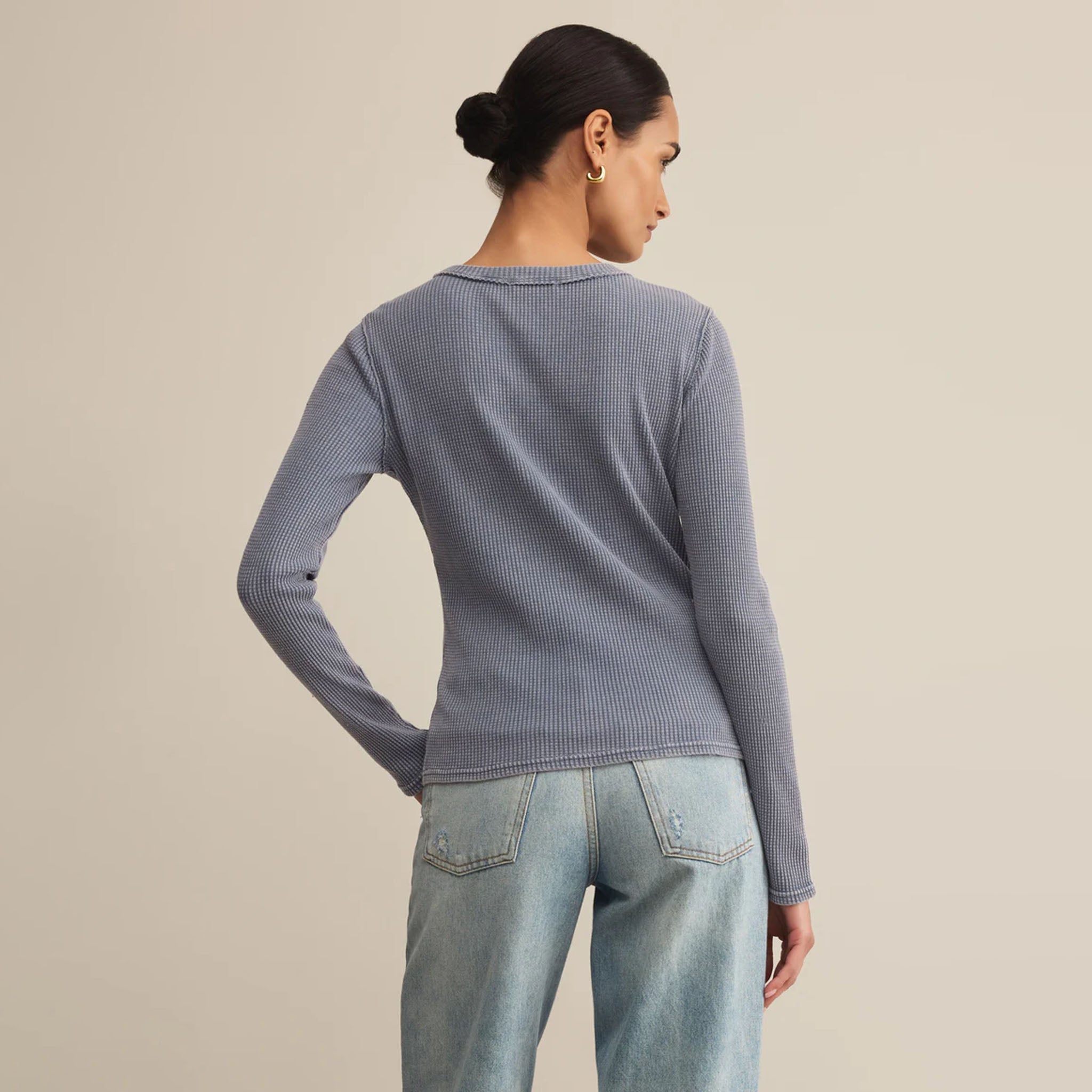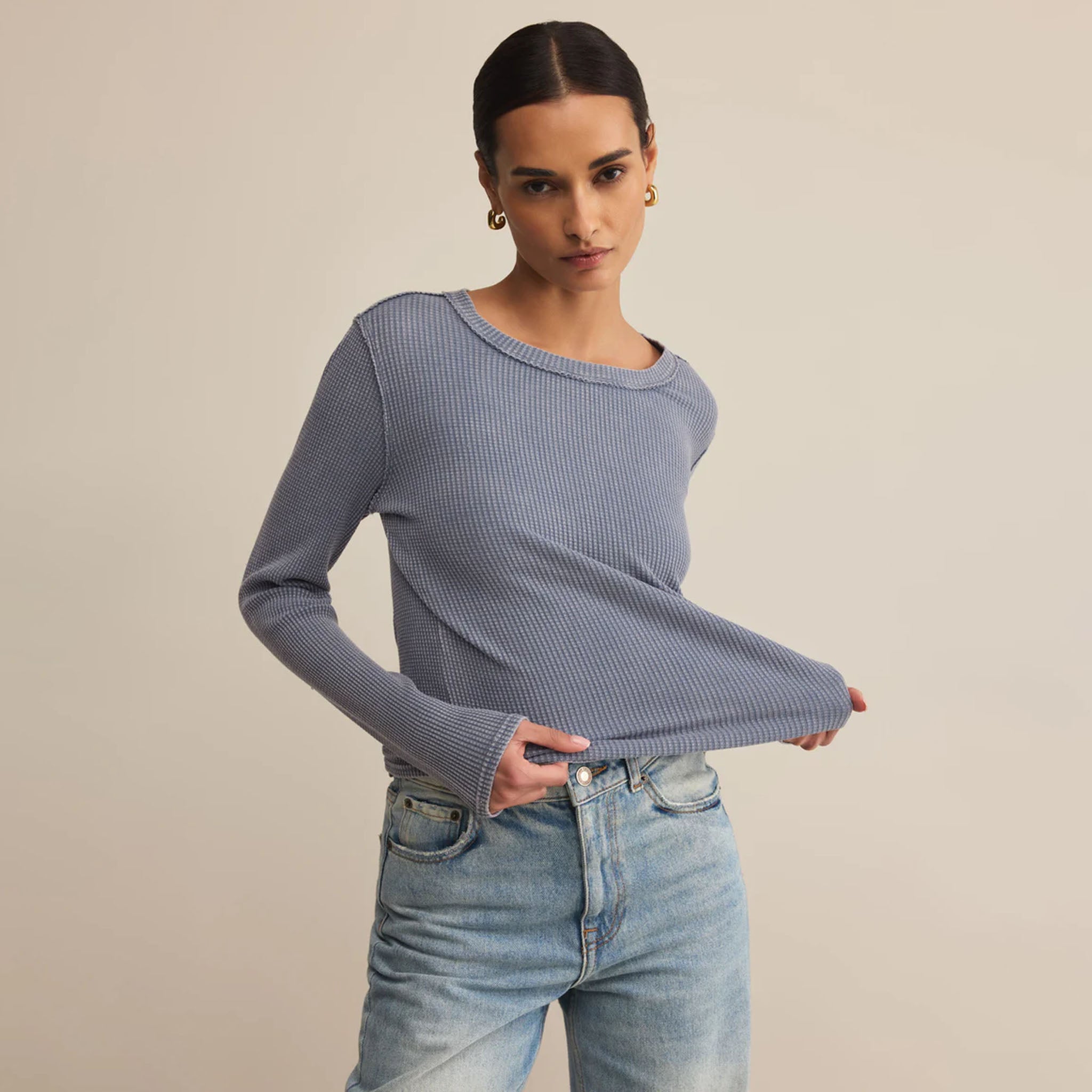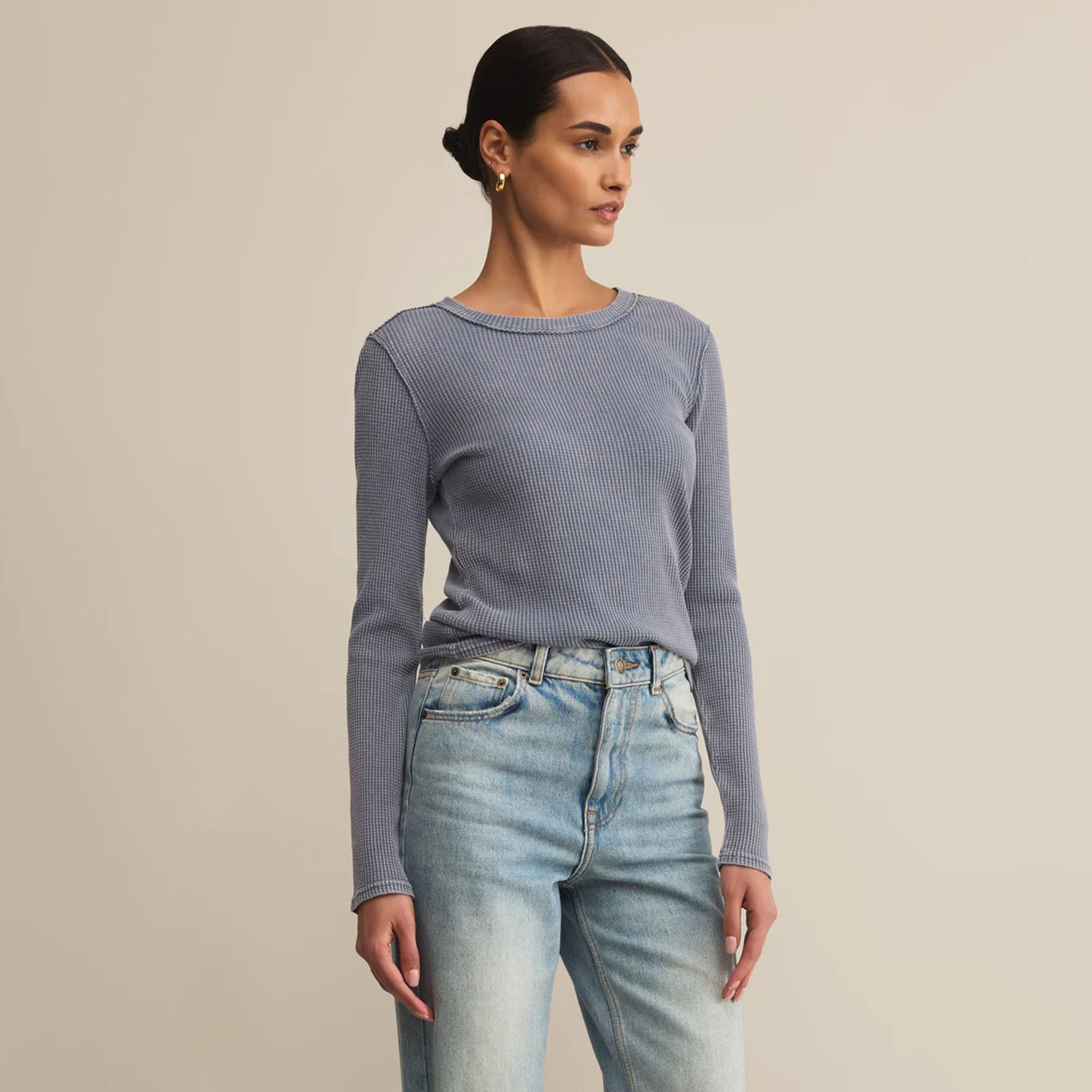 An easy essential with a lived-in twist. This fitted long sleeve is made from soft waffle thermal with raw-edge shoulder seams for that perfectly worn, forever-loved feel.