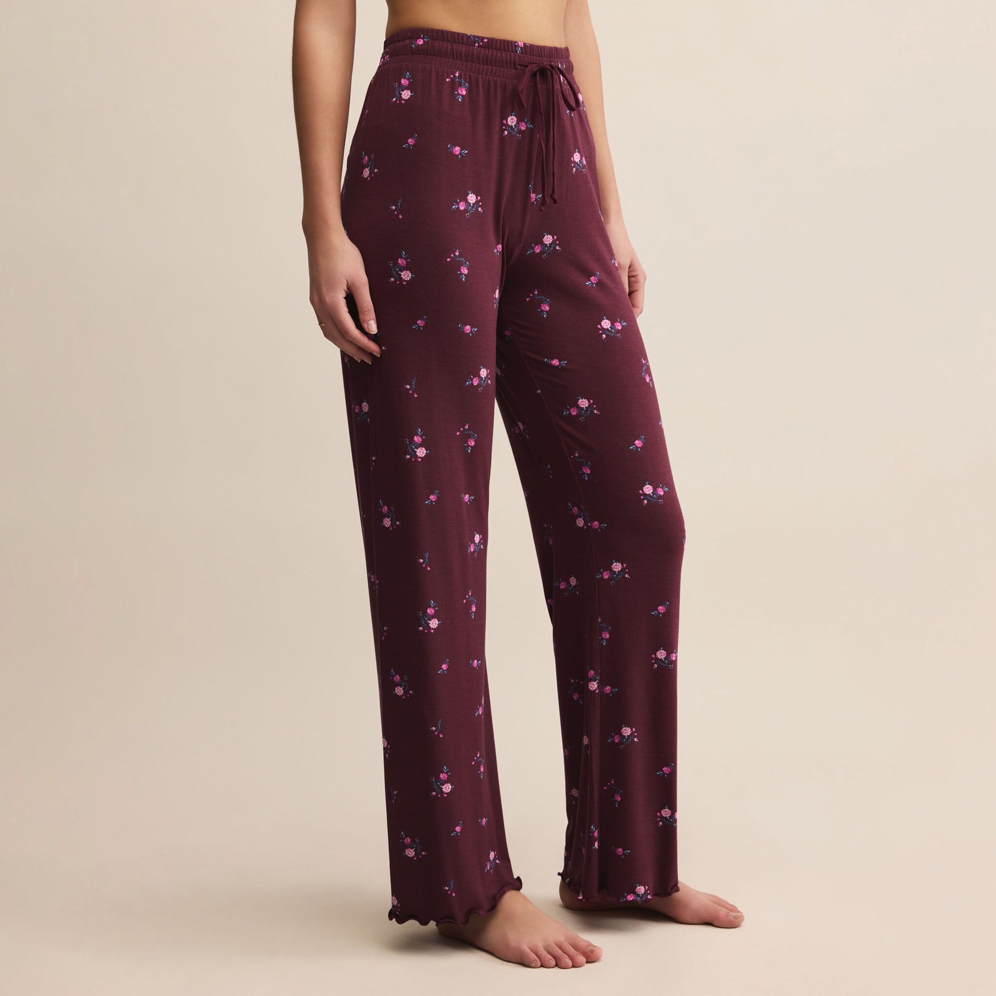 Floral, flattering, and finished with a comfy waist and lettuce trim that make lounging extra sweet. Made from soft rayon modal jersey, this wide-leg pant flows with ease for all-day comfort. The ditsy floral print adds a feminine touch, while the high rise and drawcord waistband keep it relaxed and easy to pair with a fitted tank or cozy top.