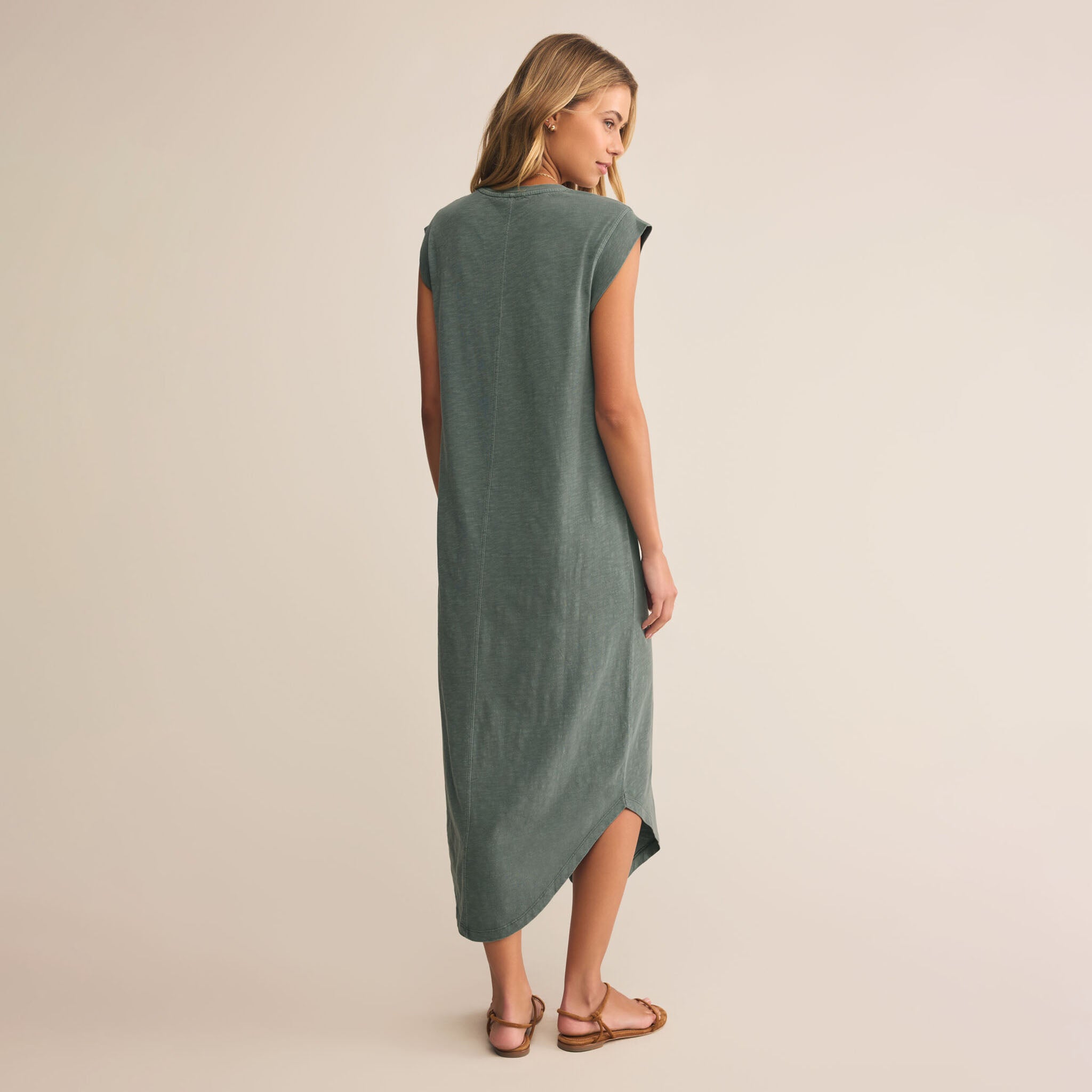 The Z Supply Calabasas Midi Dress in Hunter Green is your new go-to for easy, everyday style with a playful twist. This dress features a classic crew neck and comfy short sleeves, perfect for keeping things casual yet chic. Its curved hemline adds a fun, flirty shape and extra movement, making every step feel light and breezy.