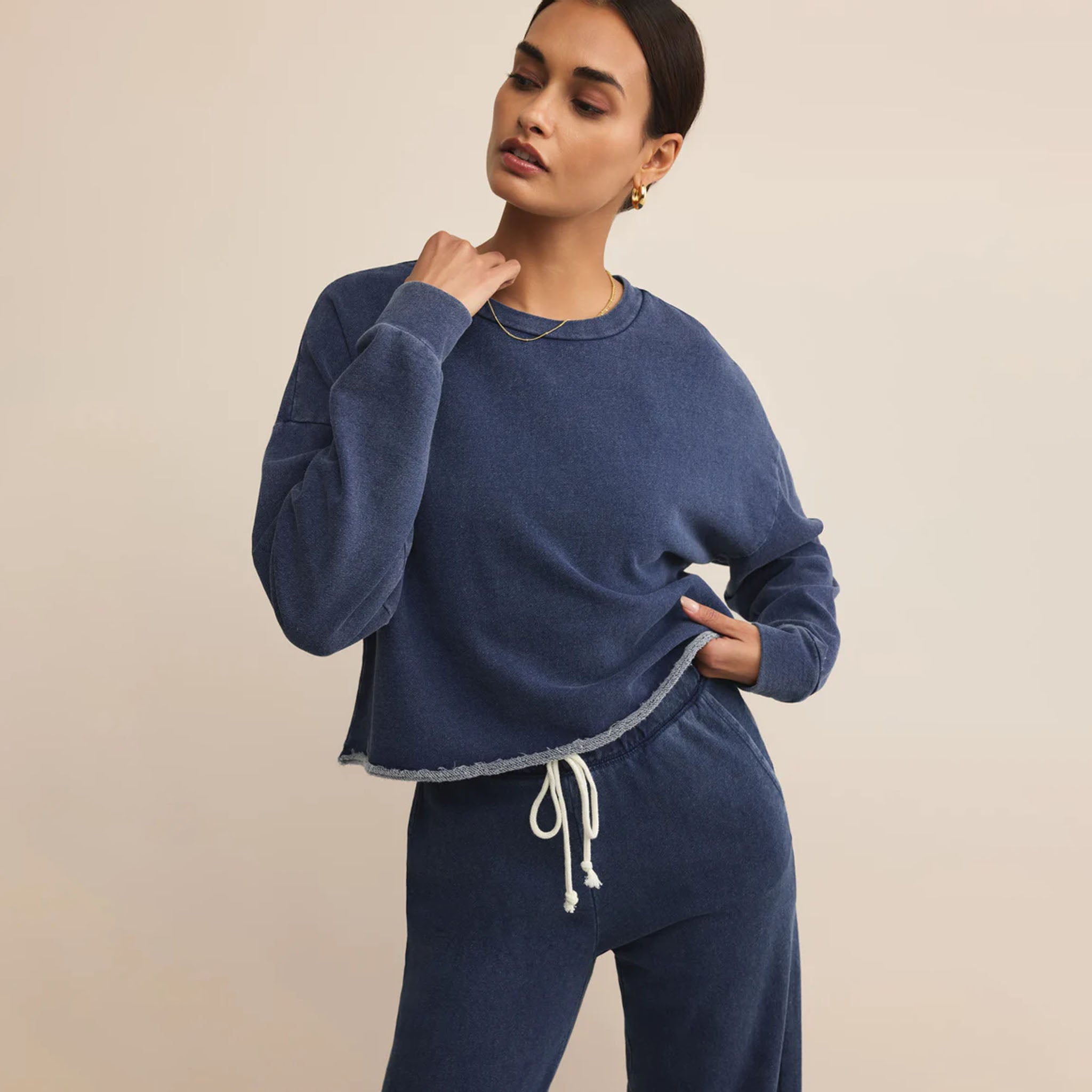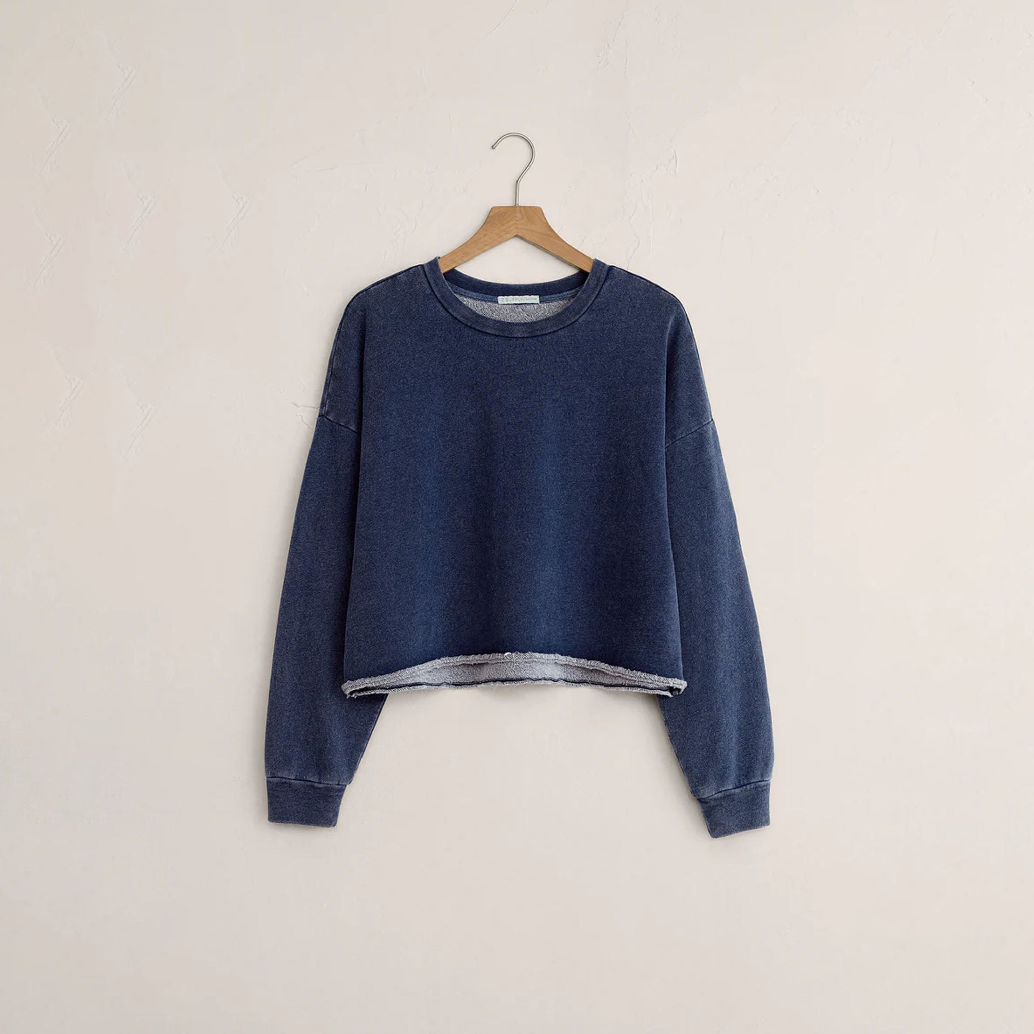 Crafted from knit denim french terry with a lived-in mineral wash, this relaxed crew has that just-right slouch and an edge of raw hem detailing, perfect for layering over leggings or pairing with matching bottoms.